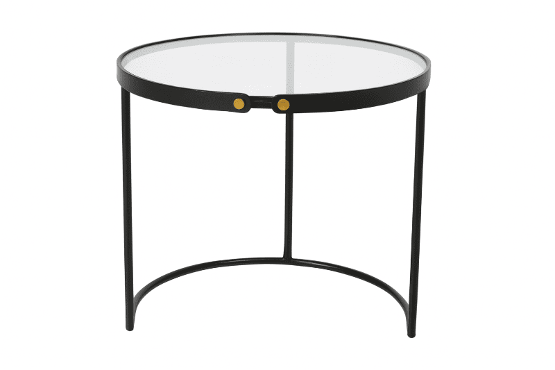 Round glass-top side table featuring a slim black metal frame with brass accents at the joints.
