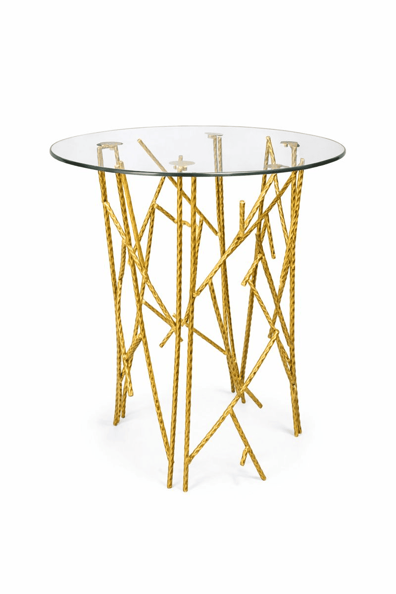 Round metal side table with glass top featuring a sculptural base formed from intersecting branch-like rods finished in gold.