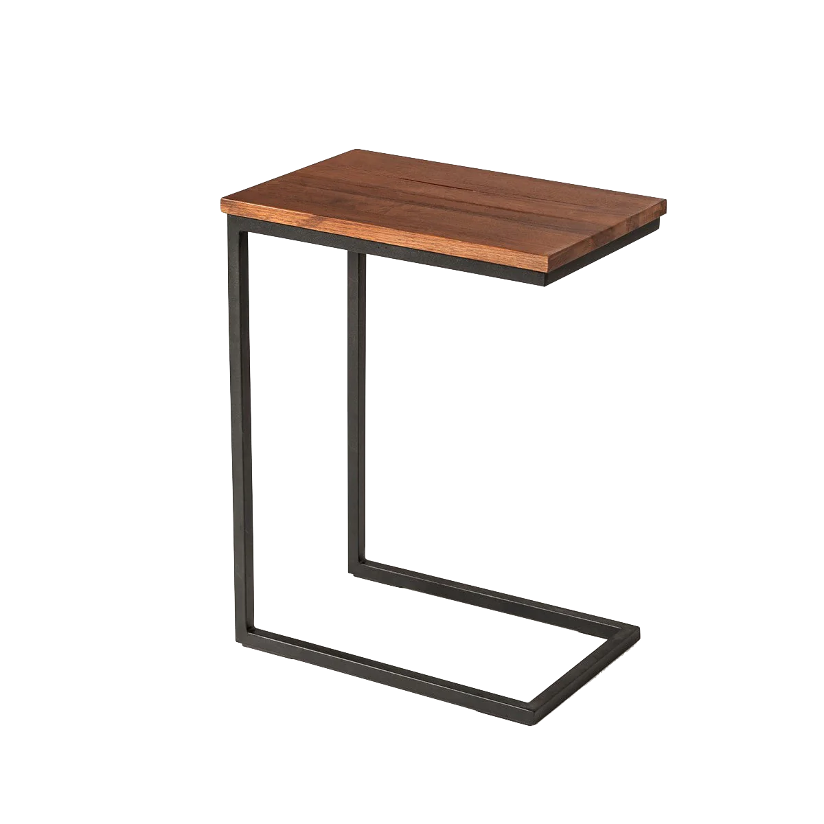 Gooseneck style side table with natural wood top with black metal base.
