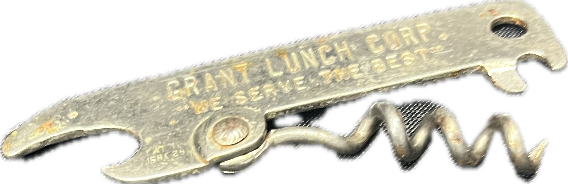 Grant Lunch Corp “we serve the best” metal bottle opener and corkscrew from 1920’s.