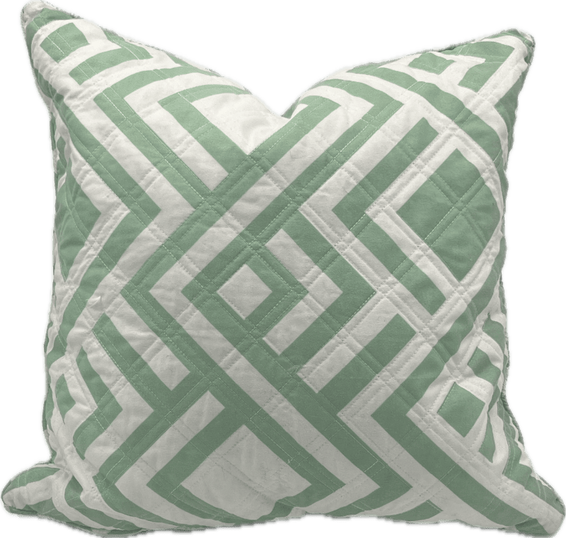 Quilted square pillow with green and white geometric pattern.