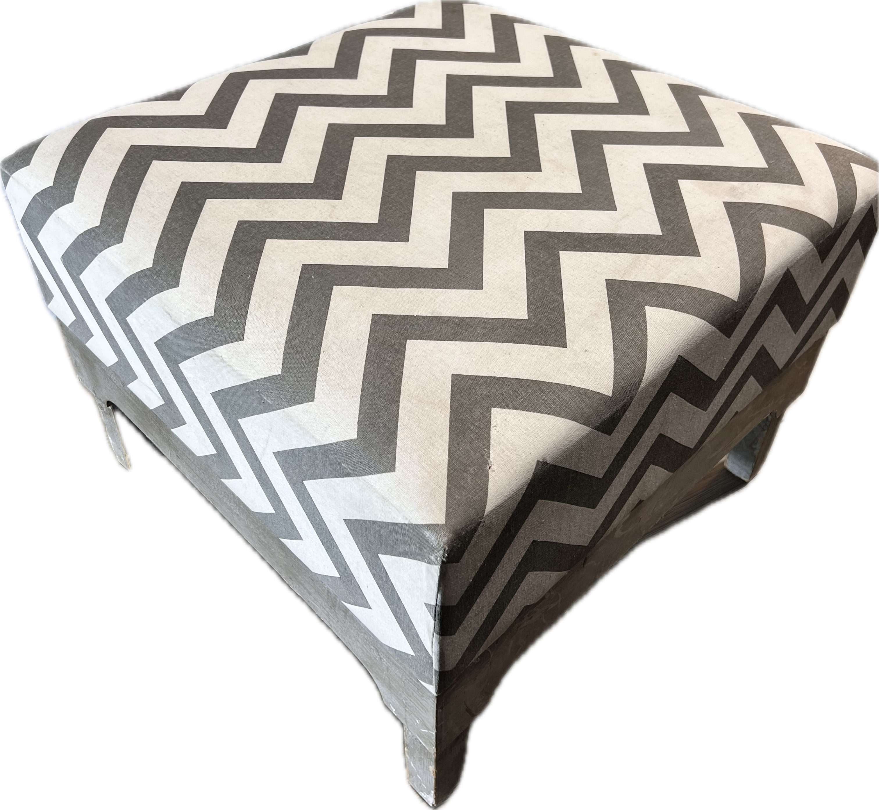 Grey and white chevron patterned ottoman on grey wood base.