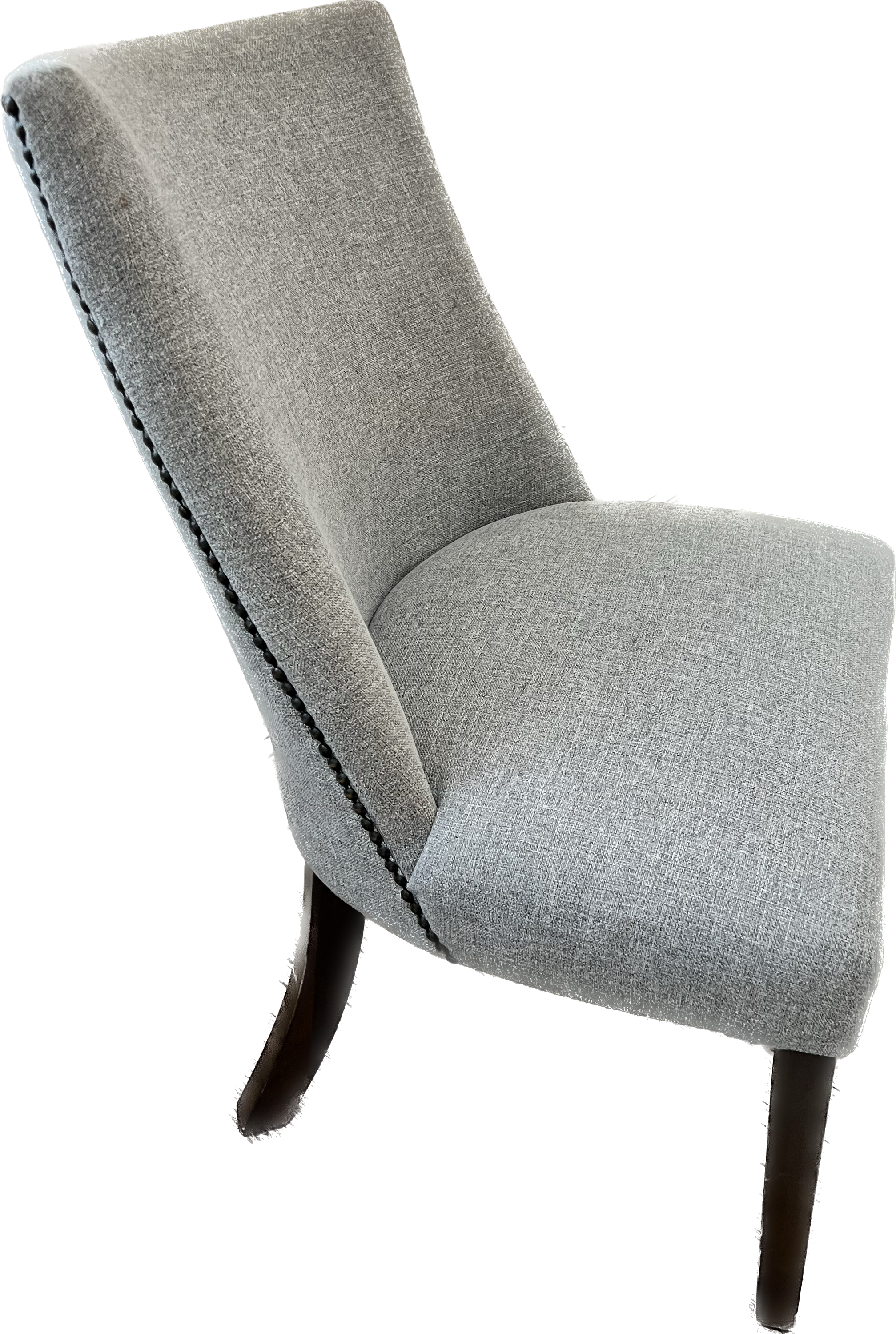 Grey upholstered dining chair with dark wood legs.