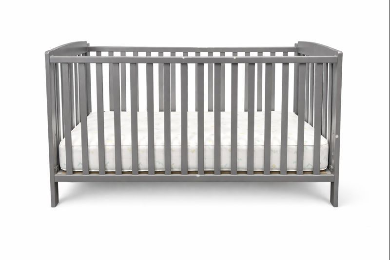 Standard-size foldable baby crib constructed of painted wood with vertical slat sides and curved top rails. Finished in neutral gray. Includes crib mattress.
