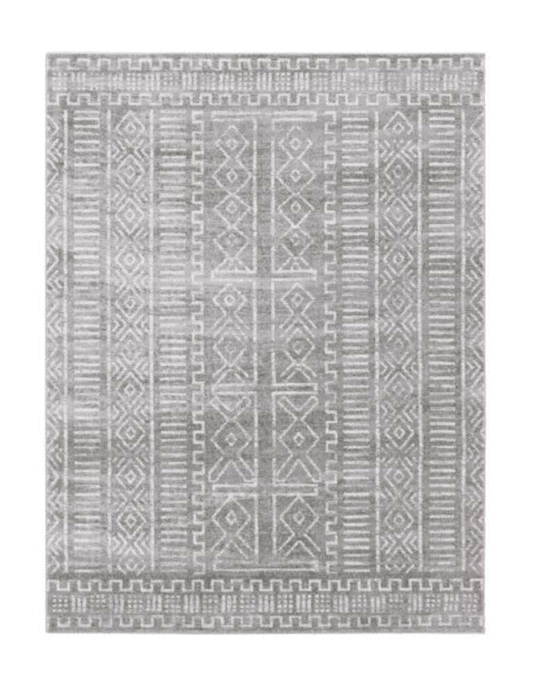 A soft gray area rug featuring an intricate geometric pattern that adds subtle texture.