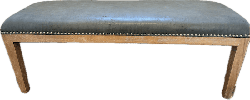 Grey leather bench finished with a single row of silver nailhead trim along the lower edge of the cushion. Legs are natural wood tone.