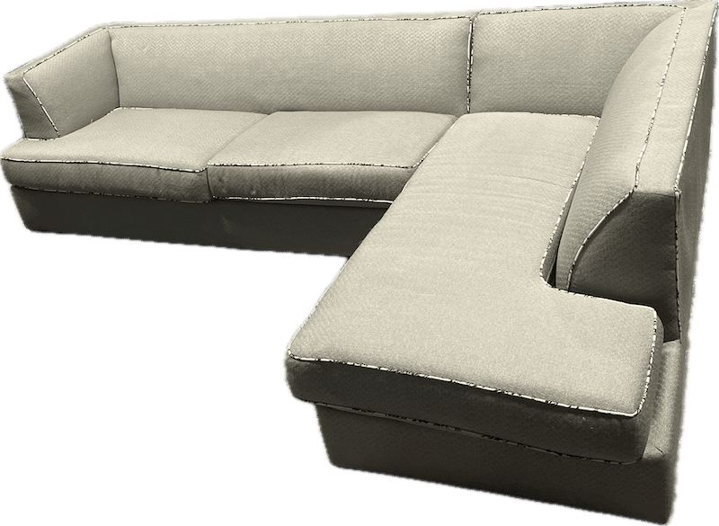 Modern upholstered sectional sofa featuring a left-facing 82 inch chaise and low-profile back. Upholstered in a neutral linen-textured fabric with contrast edge stitching.
