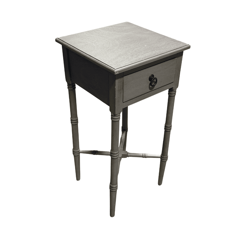 Narrow rectangular wood side table finished in medium gray. Features one upper drawer with black metal drop pull. Set on four turned legs with lower stretcher supports on all sides.