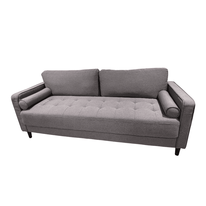 A streamlined modern sofa upholstered in soft grey fabric with button-tufted seating and two matching bolster pillows. Featuring clean mid-century lines and a comfortable, structured profile.