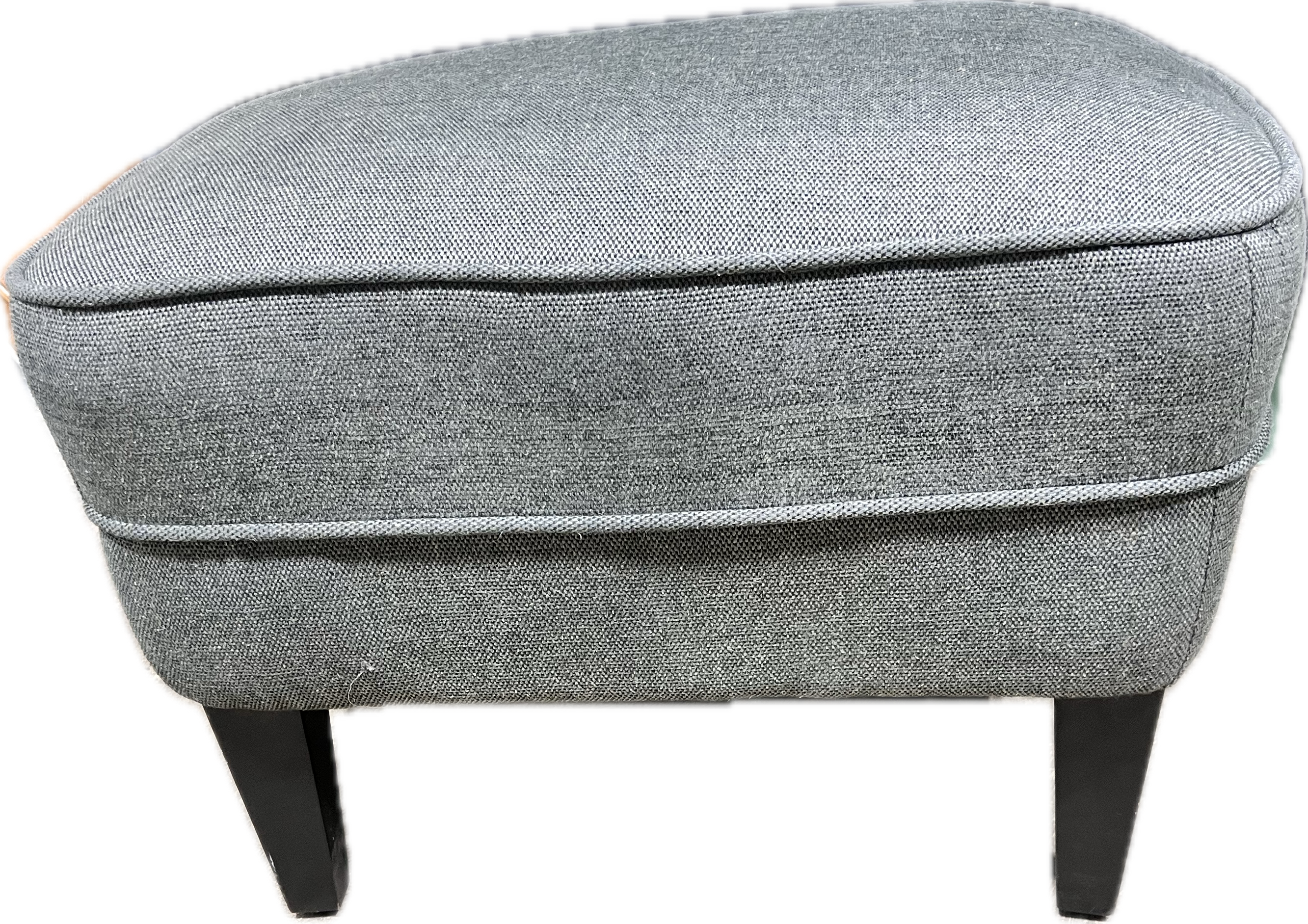 Upholstered grey ottoman with wood legs.
