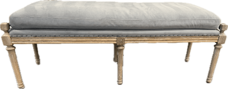 Light grey velvet bench with light wood distressed legs.
