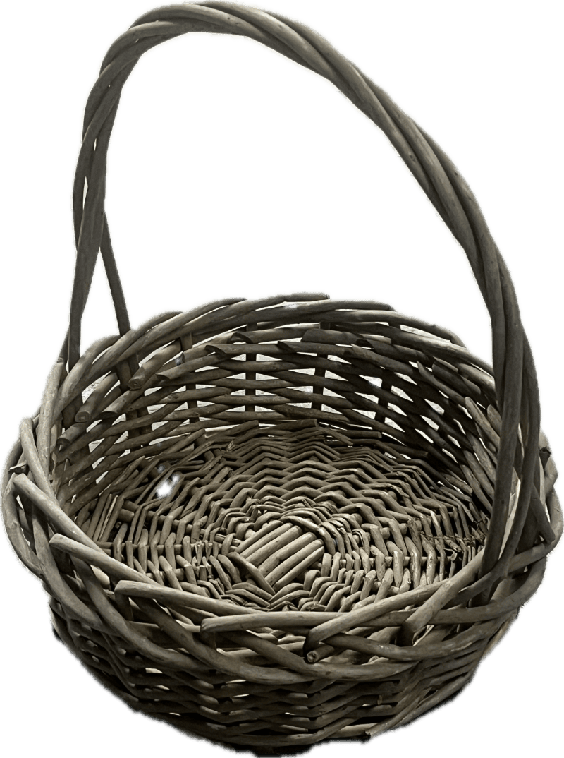 Grey wicker basket with large rim and handle.