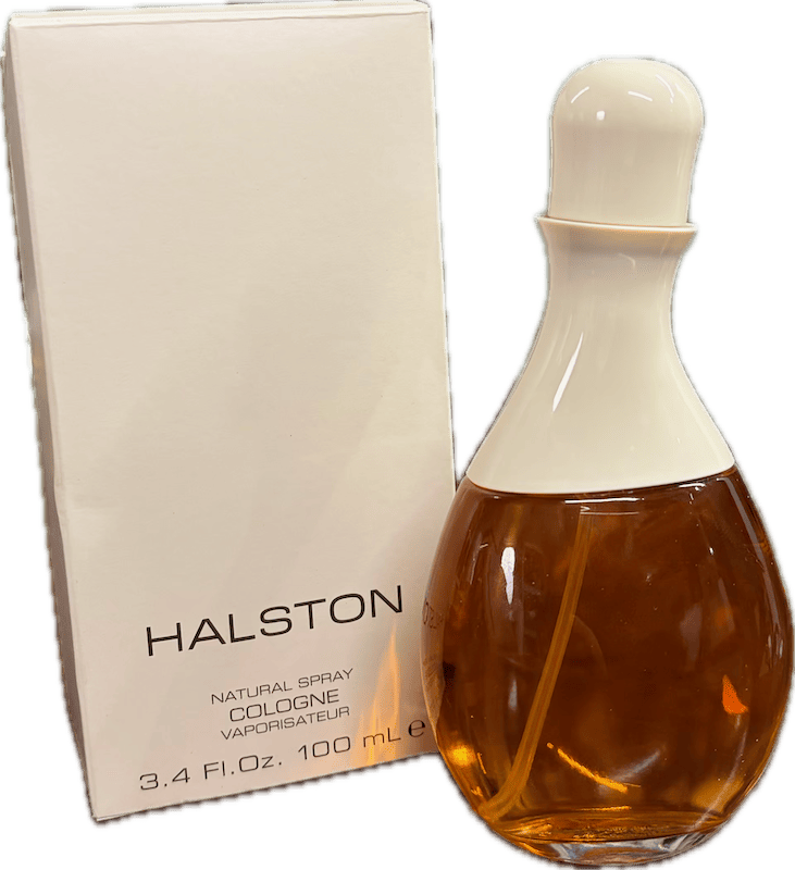 Vintage Halston perfume bottle with original packaging. Features an amber glass bottle with cream spray top and matching cap.