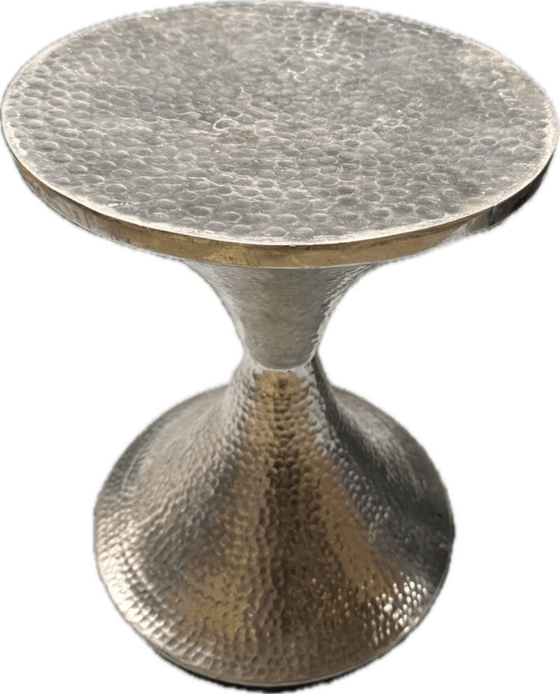 Round metal side table with a sculptural pedestal base and a fully hammered surface texture.