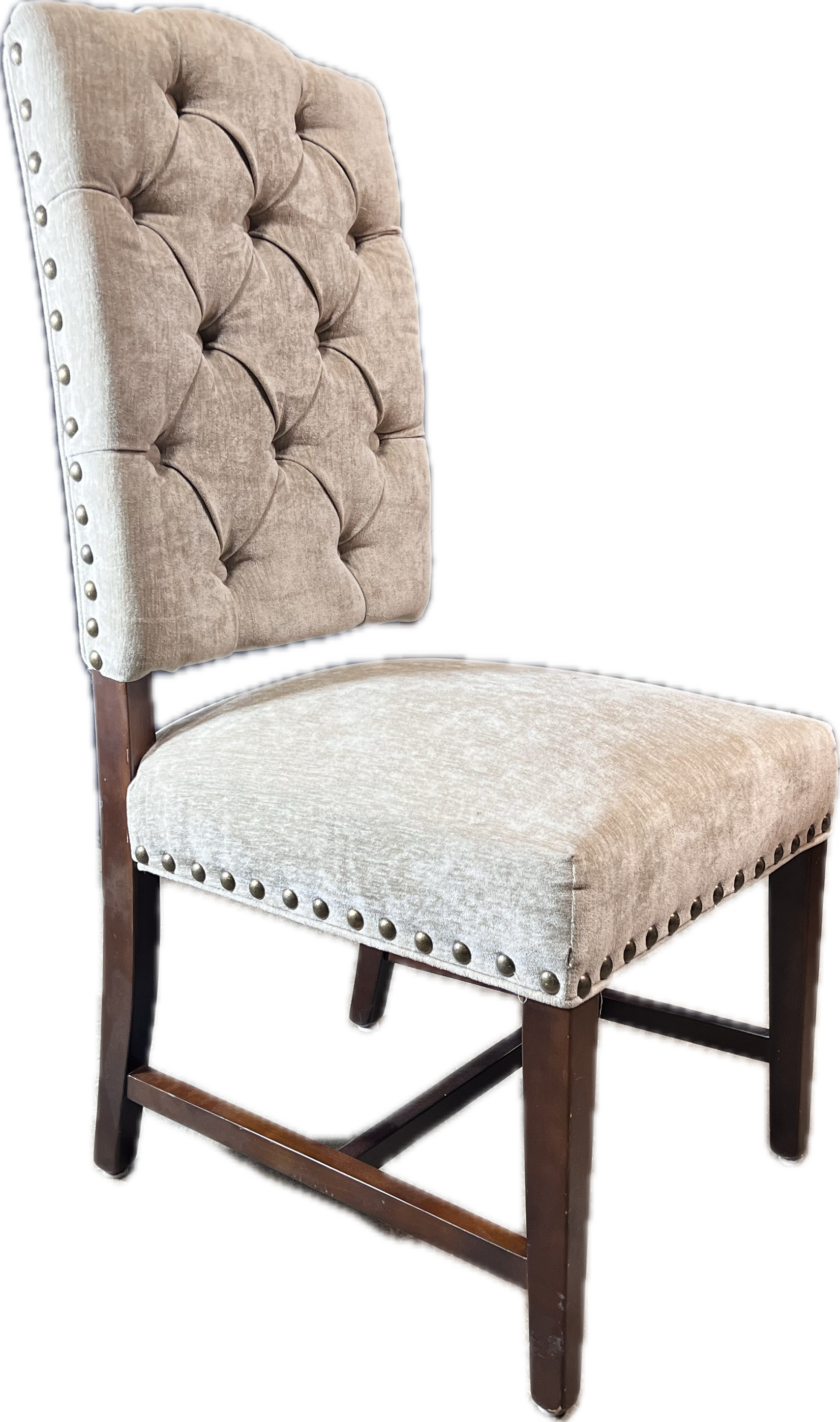 High back beige velvet tufted dining chair with nailheads.