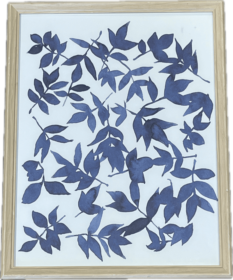 Painted blue leaves on white background with light wood frame.