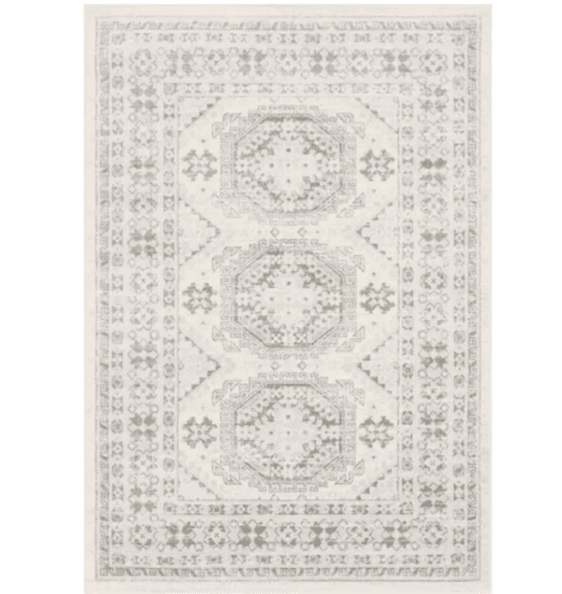 A soft ivory rug featuring a subtle grey medallion and border pattern with neutral tones and traditional motif.
