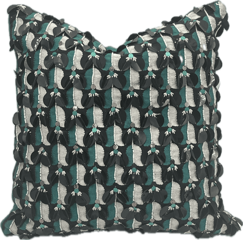 Green square pillow with black and white sequins. Kate Spade.