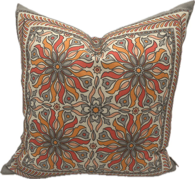 Large orange and grey art nouveau floral pattern pillow.