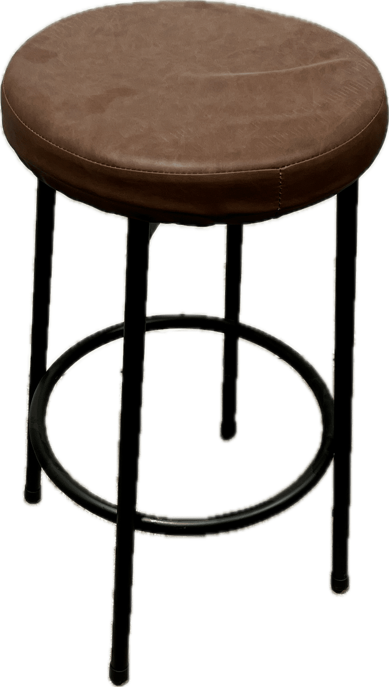 Backless round stool featuring a cushioned upholstered seat in brown faux leather and a black metal base with circular footrest.