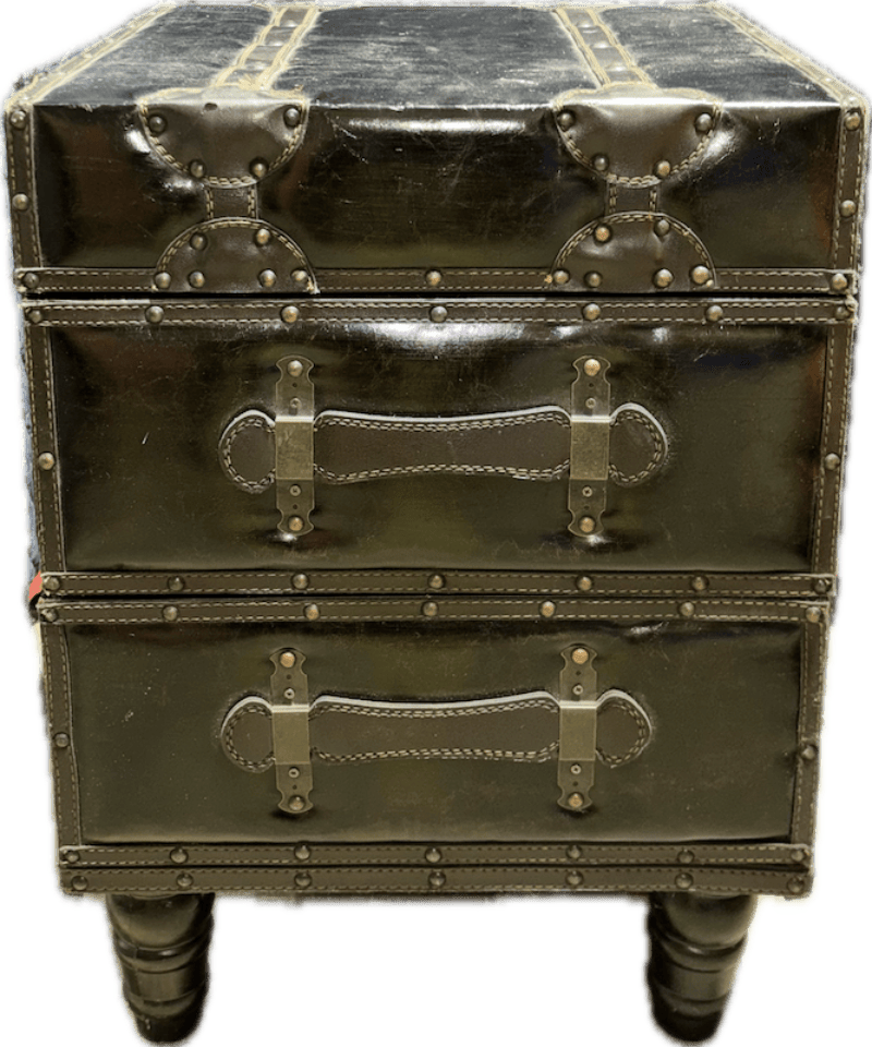 Compact trunk-style side table wrapped in dark leather with stitched detailing and metal corner hardware. Features two pull-out drawers with leather strap handles and short turned legs.