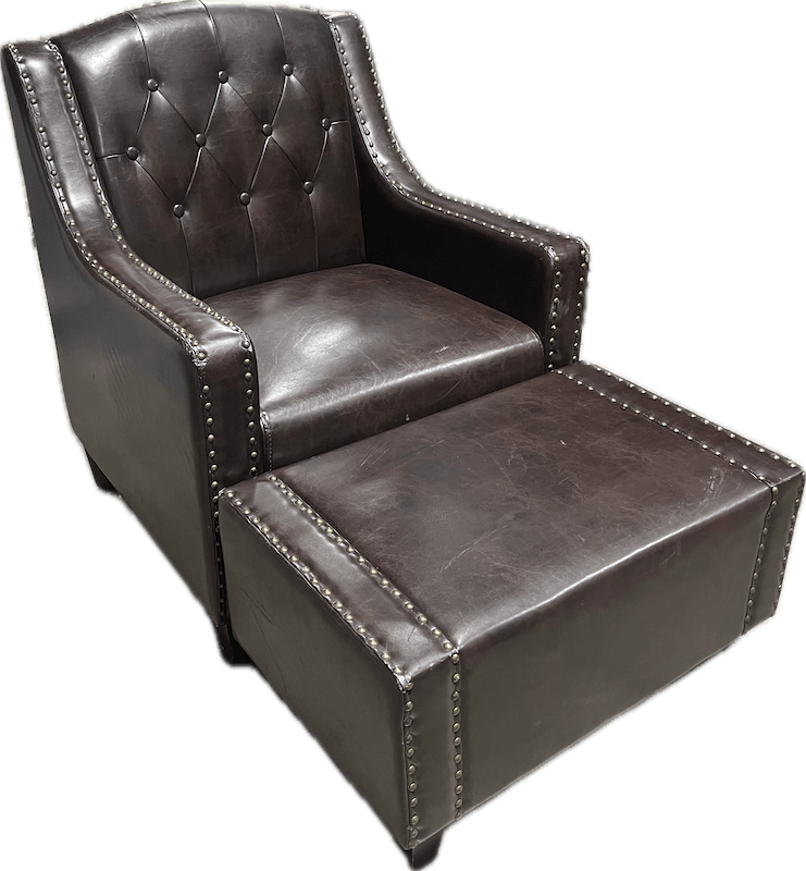 Classic club chair upholstered in brown leather with a tufted backrest and rolled arms. Decorative nailhead trim outlines the arms and base, adding tailored detail. Paired with a matching upholstered ottoman that measures 16 inches high, 18 inches deep, and 29 inches wide.