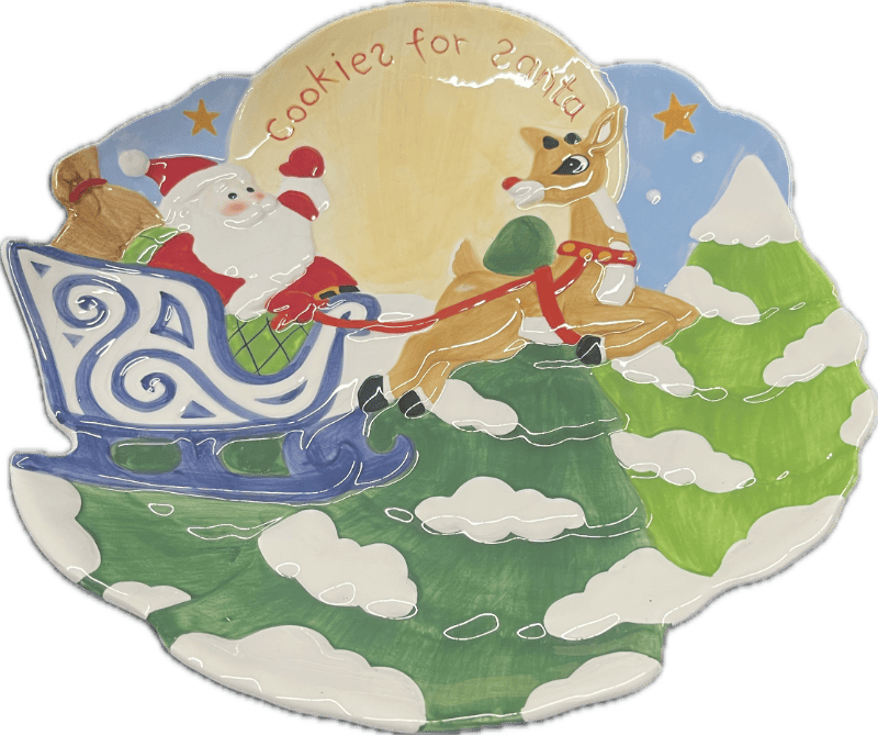 Rudolph the Red-Nosed Reindeer cookie plate, with Santa’s sleigh, Rudolph, and evergreen trees with snow, made in 2002.