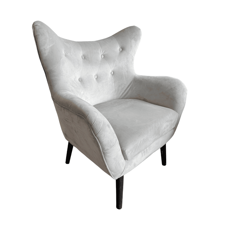 A stylish light blue velvet wingback chair featuring a gently curved silhouette, button tufting, and sleek tapered black legs.