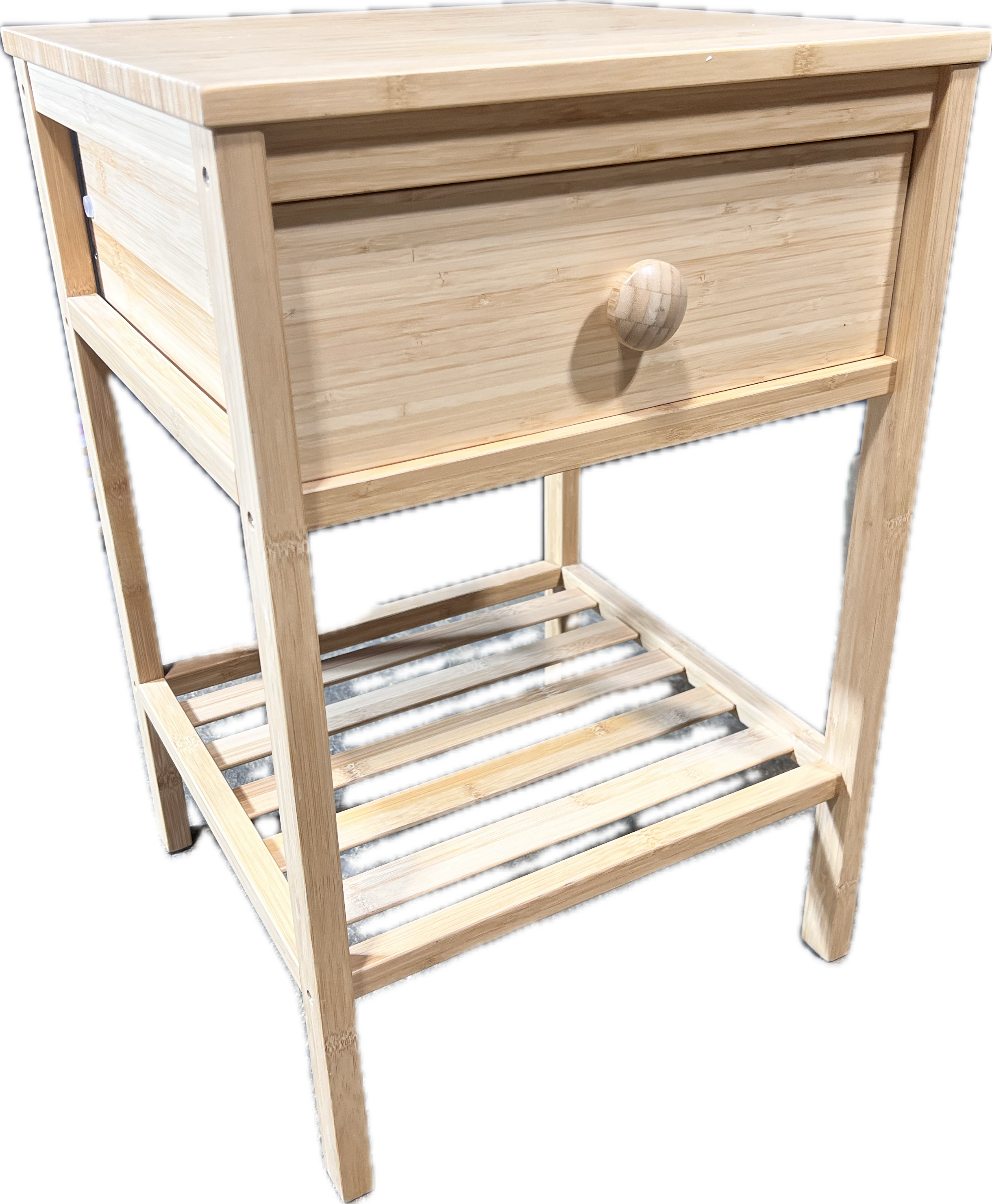 Natural wood bedside table with 1 drawer and a shelf.
