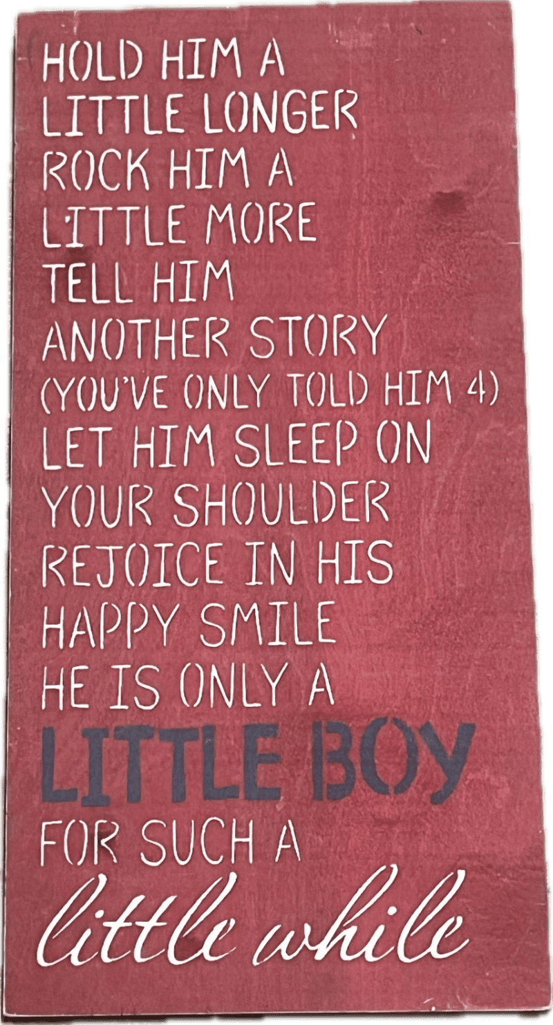 Red wood panel with white lettering quote “hold him a little longer rock him a little more tell him another story (you’ve only told him 4) let him sleep on your shoulder rejoice in his happy smile he is only a little boy for such a little while”.