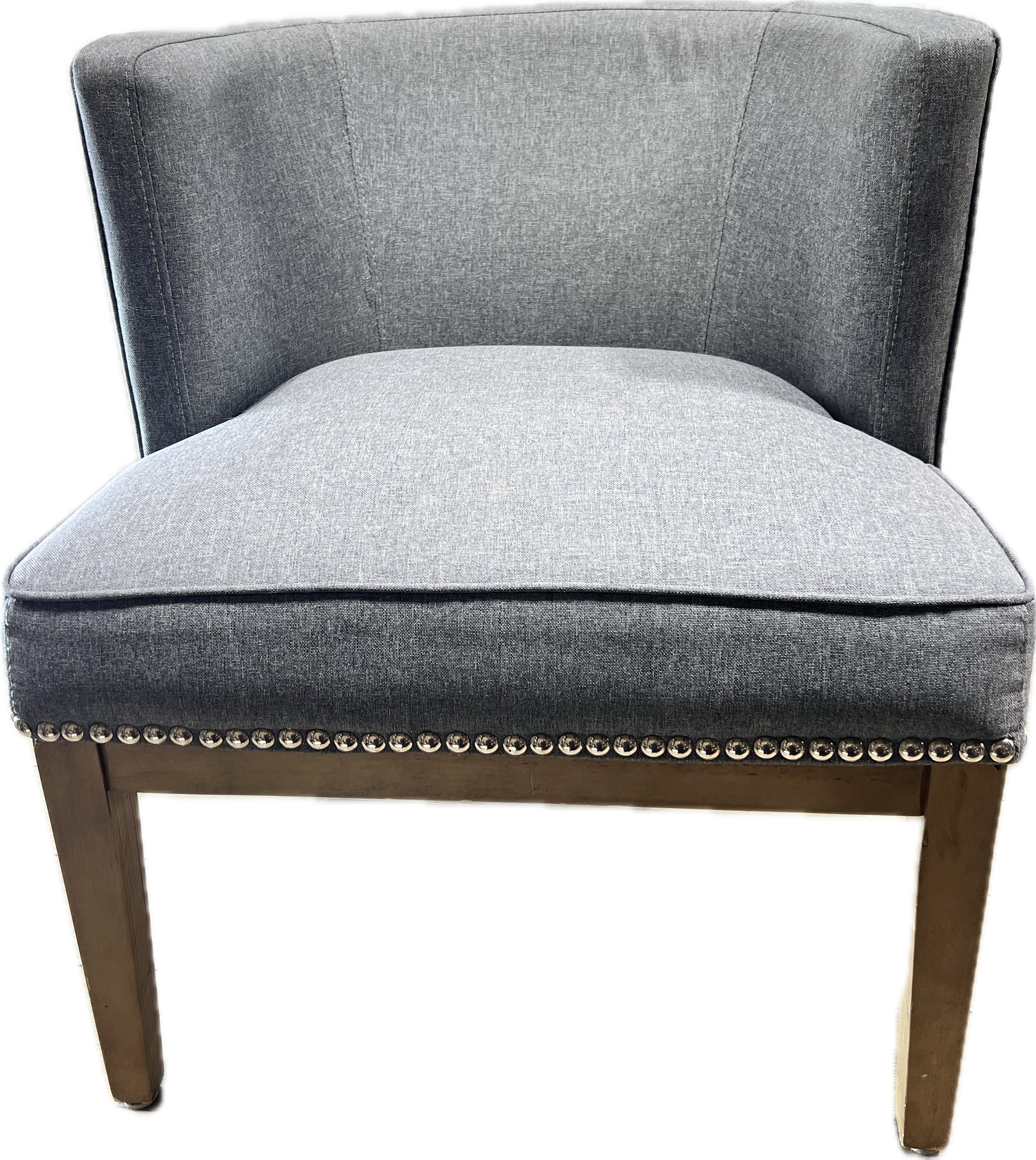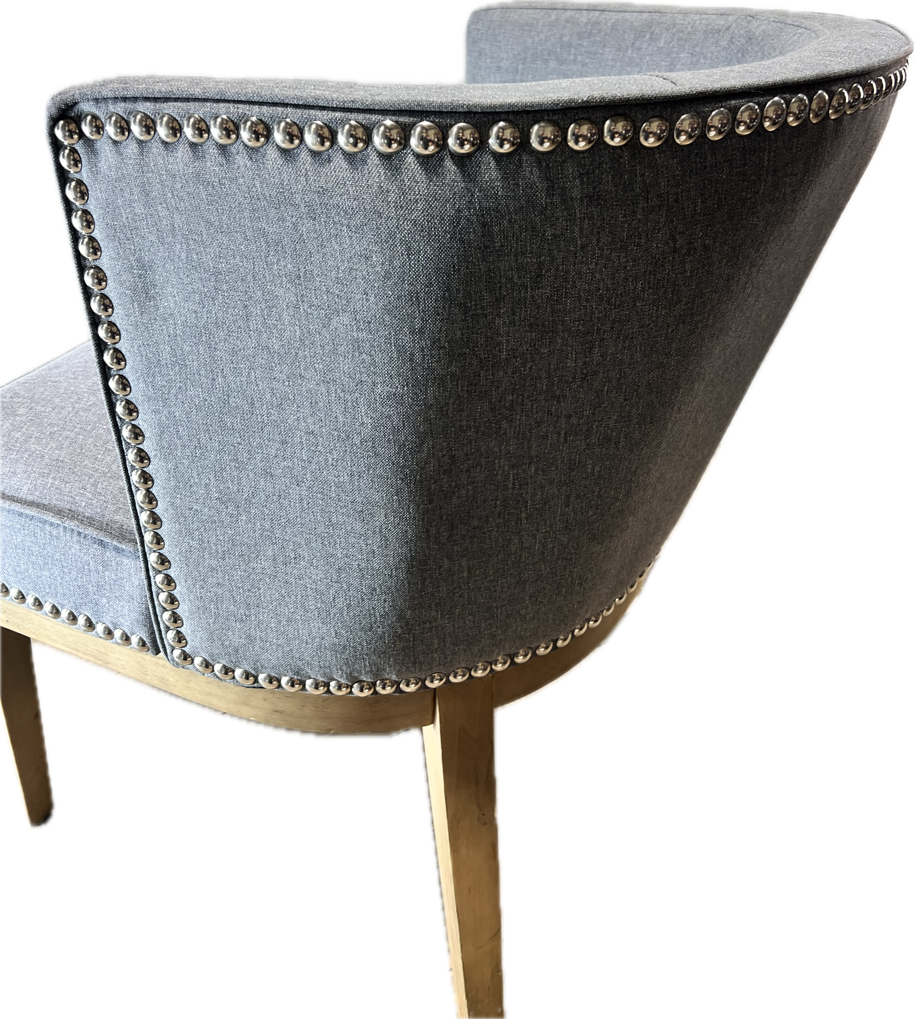 Modern grey, rounded low-back accent chair with silver nailheads.