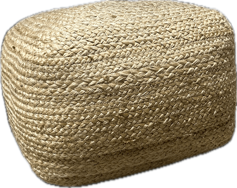 Rectangular pouf handwoven from natural jute fibers with a tight braided texture throughout.