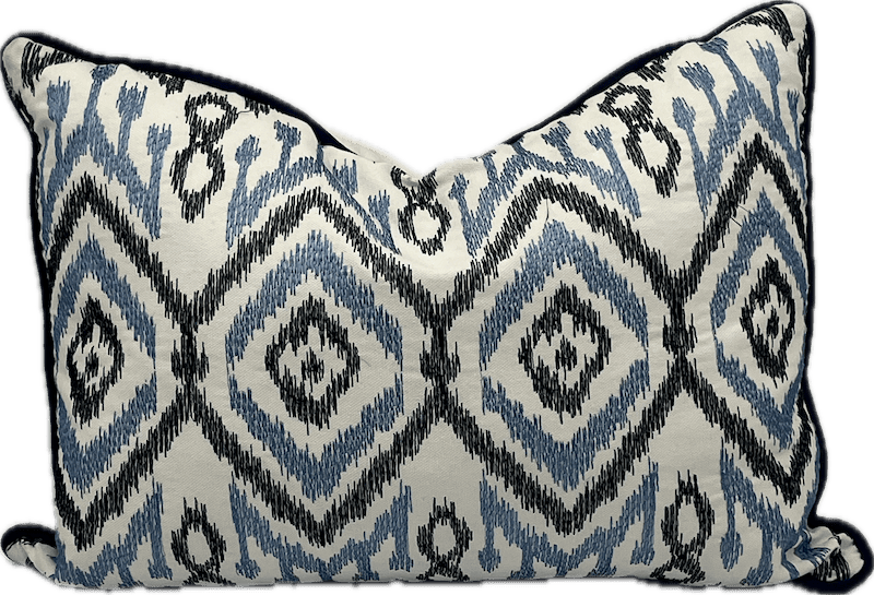 A blue and white lumbar pillow with a woven ikat-inspired diamond pattern and organic, handwoven look.