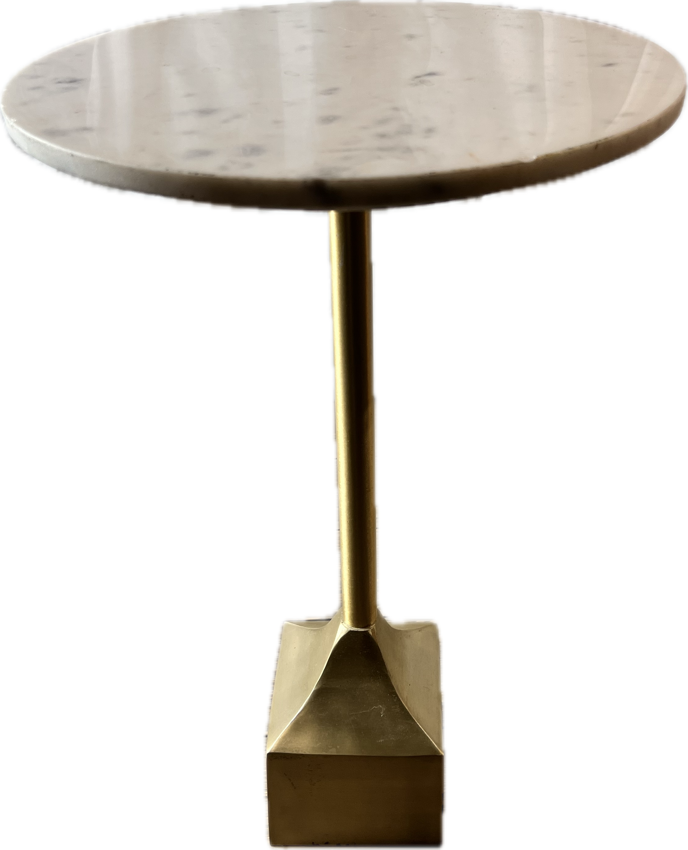 Round marble side table with gold block base.