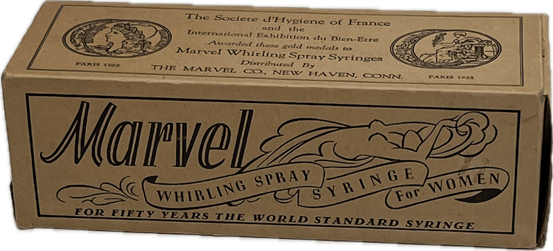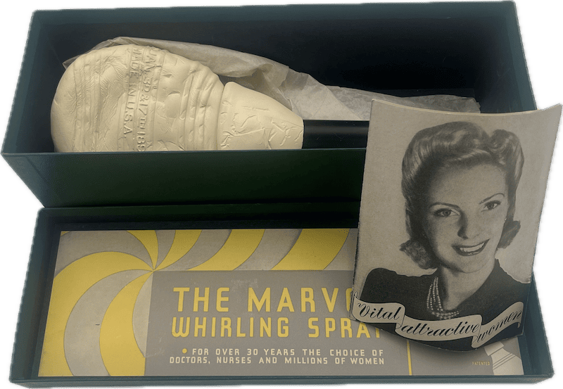 Vintage vaginal douche, the Marvel Whirl Spray Syringe for women made of rubber, with insert pamphlet, in a green box inside a natural cardboard box. Pre-1930.