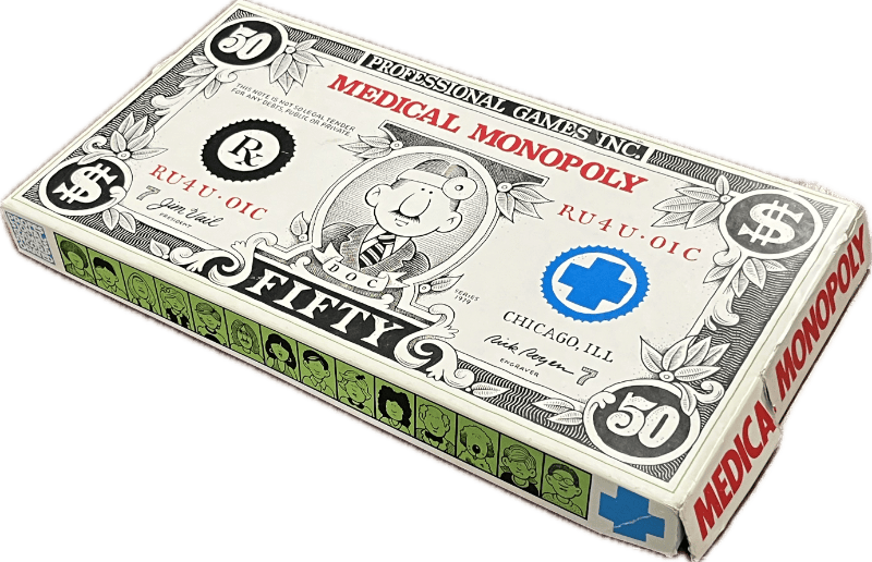 “Medical Monopoly” — a vintage parody version of the classic board game, themed around doctors, hospitals, and the business of healthcare. The box design mimics a fifty-dollar bill, featuring cartoon physician artwork and classic typography in black, white, and green with blue accents.