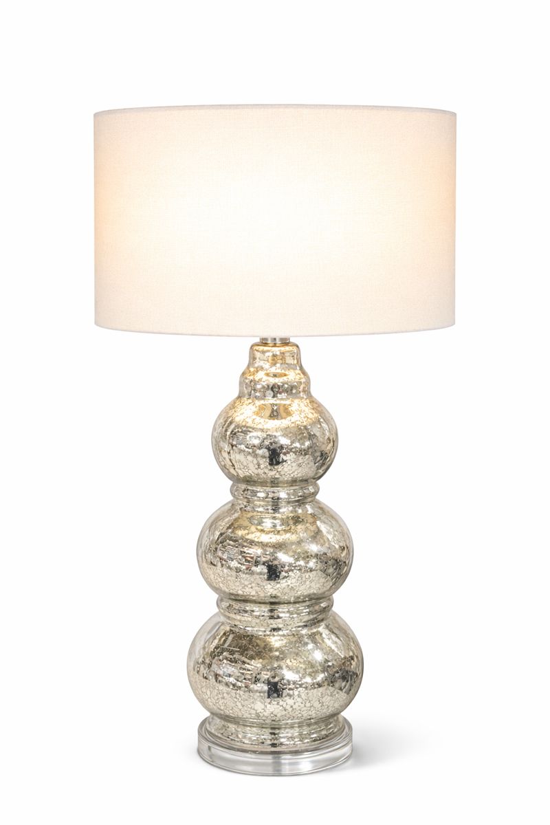 Table lamp with a stacked mercury glass composed of four rounded, gourd-style sections. Mercury glass finish on a clear circular foot.