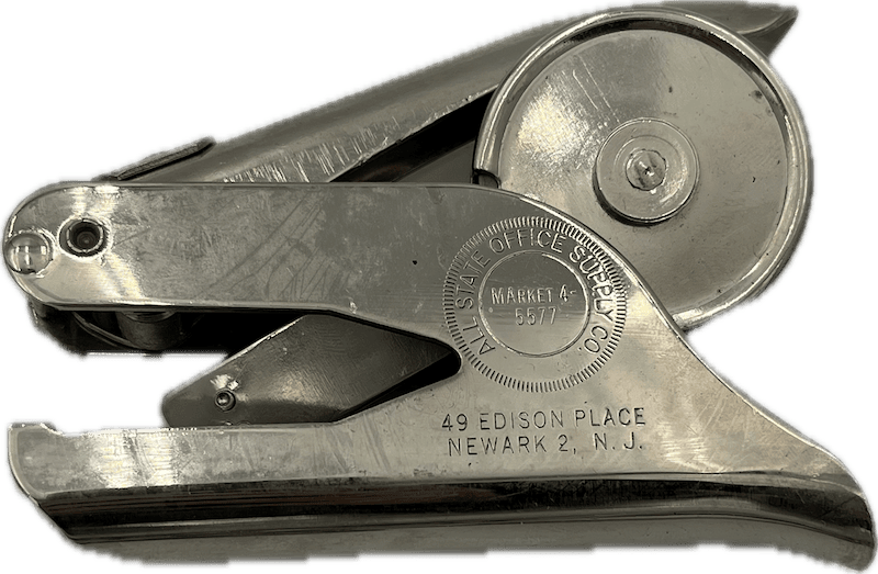 Vintage handheld metal embosser stamped “49 Edison Place, Newark 2, N.J.” on the body. Features a solid metal construction with rotating embossing wheel and integrated lever press.