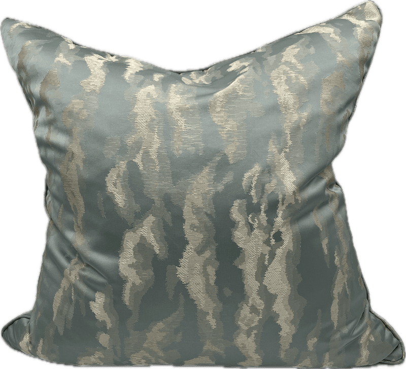 An elegant accent pillow featuring a soft smoky blue base with a subtle metallic gold abstract pattern.