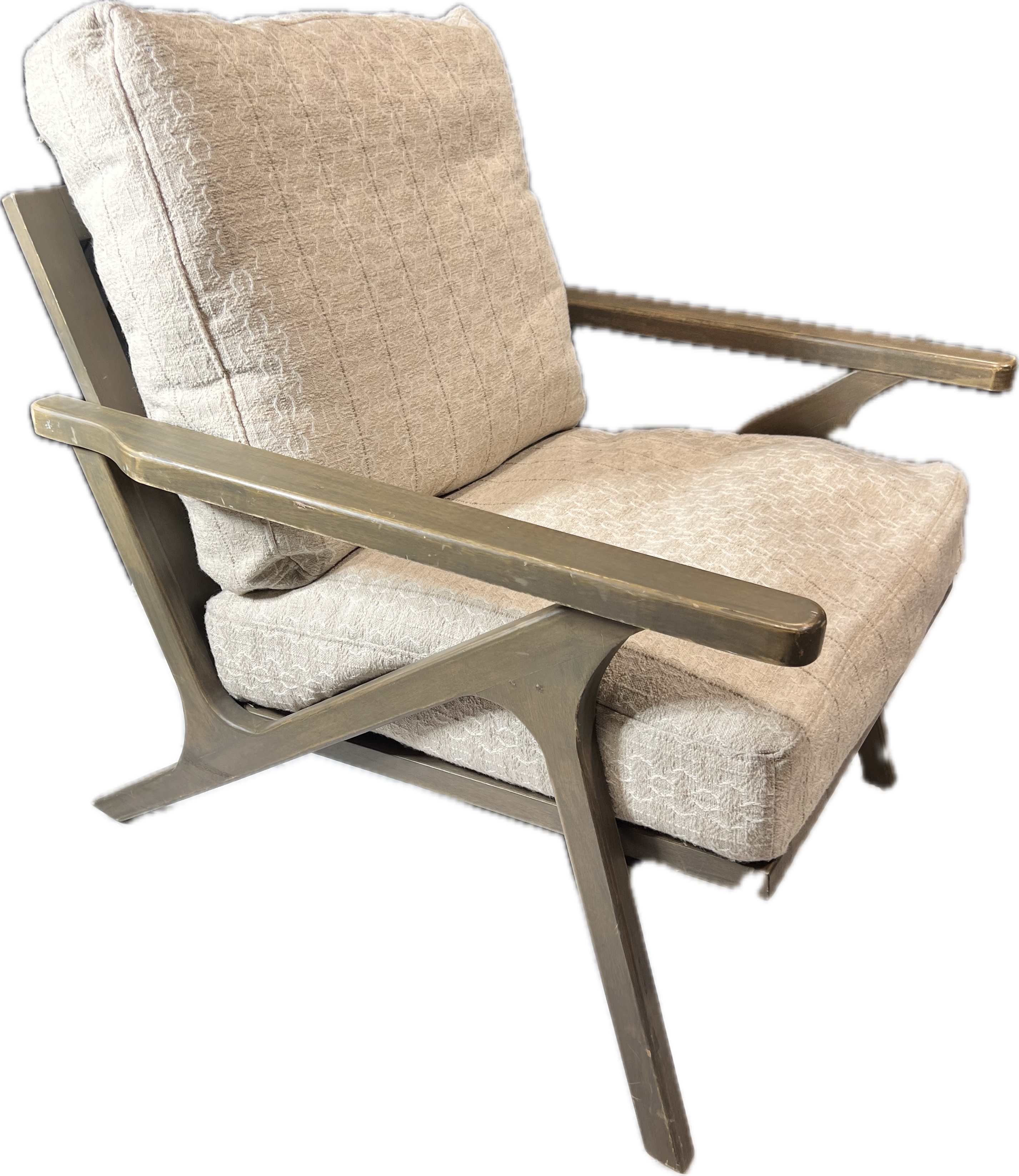Mid Century Modern style cream pattern upholstered chair on wood base.