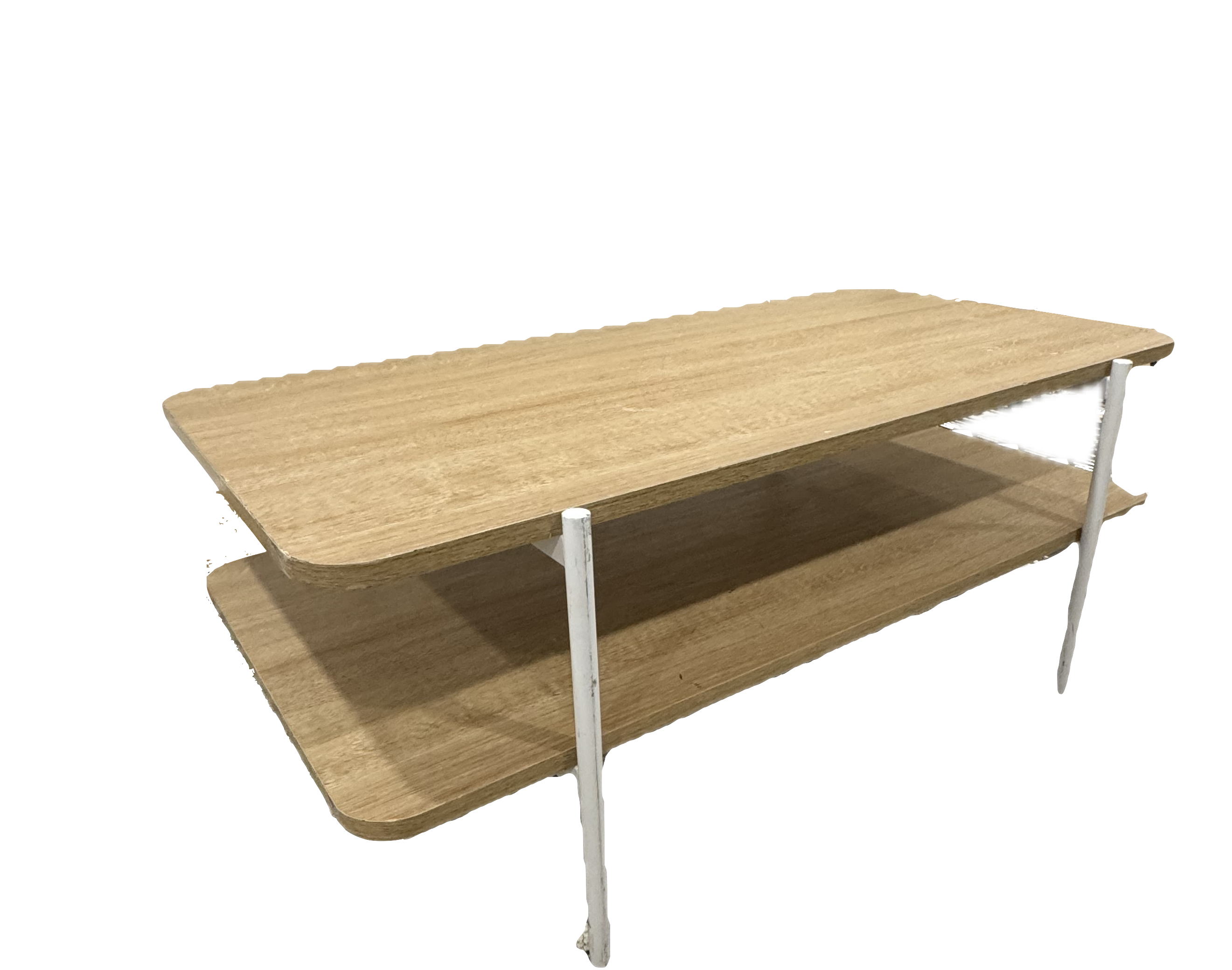 Light wood tone coffee table with 1 shelf and white metal legs.