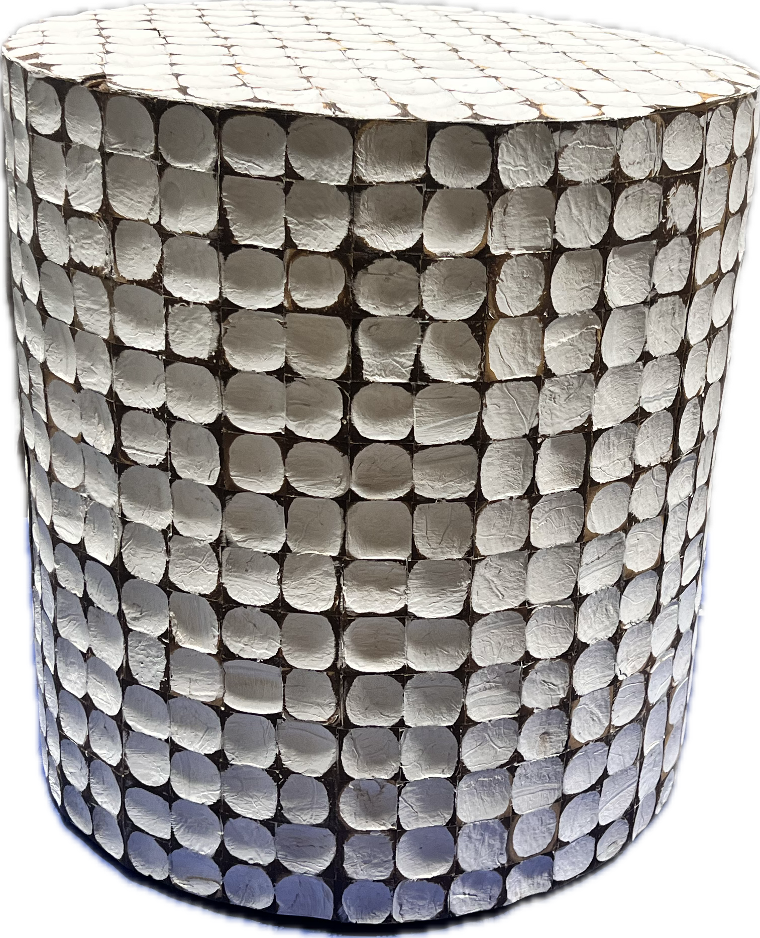Round barrel shaped white and wood textured side table. Has matching rectangular coffee table. 32000047