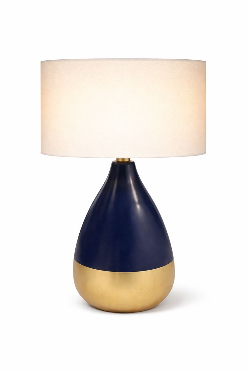 Navy blue ceramic table lamp with gold base and a tapered neck that transitions into a rounded form.