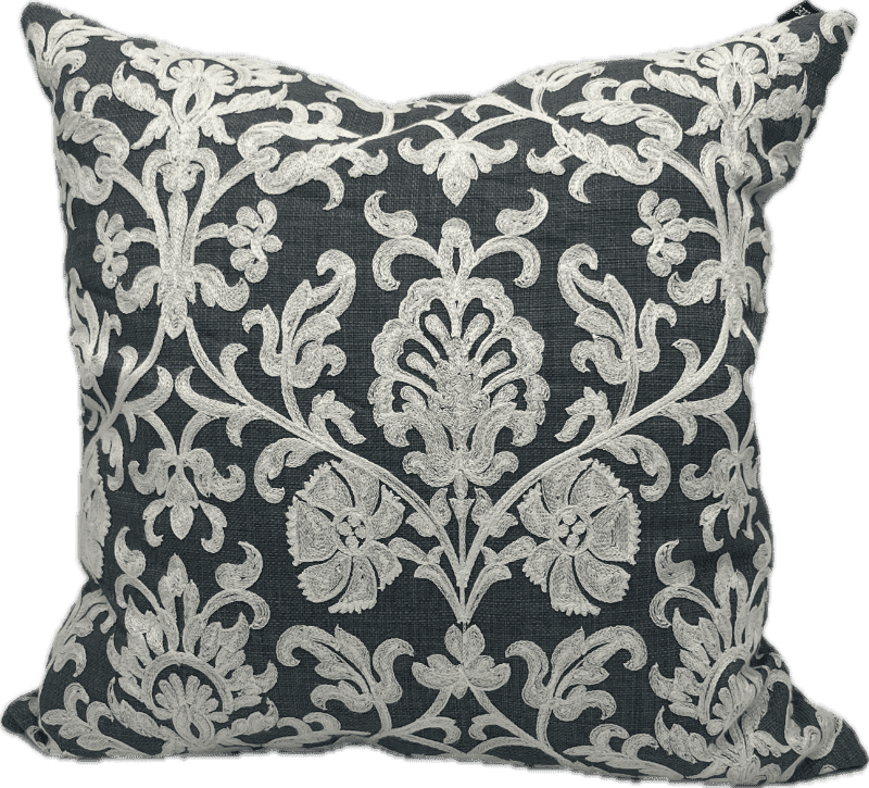 Boho navy pillow featuring an ornate ivory damask embroidery.
