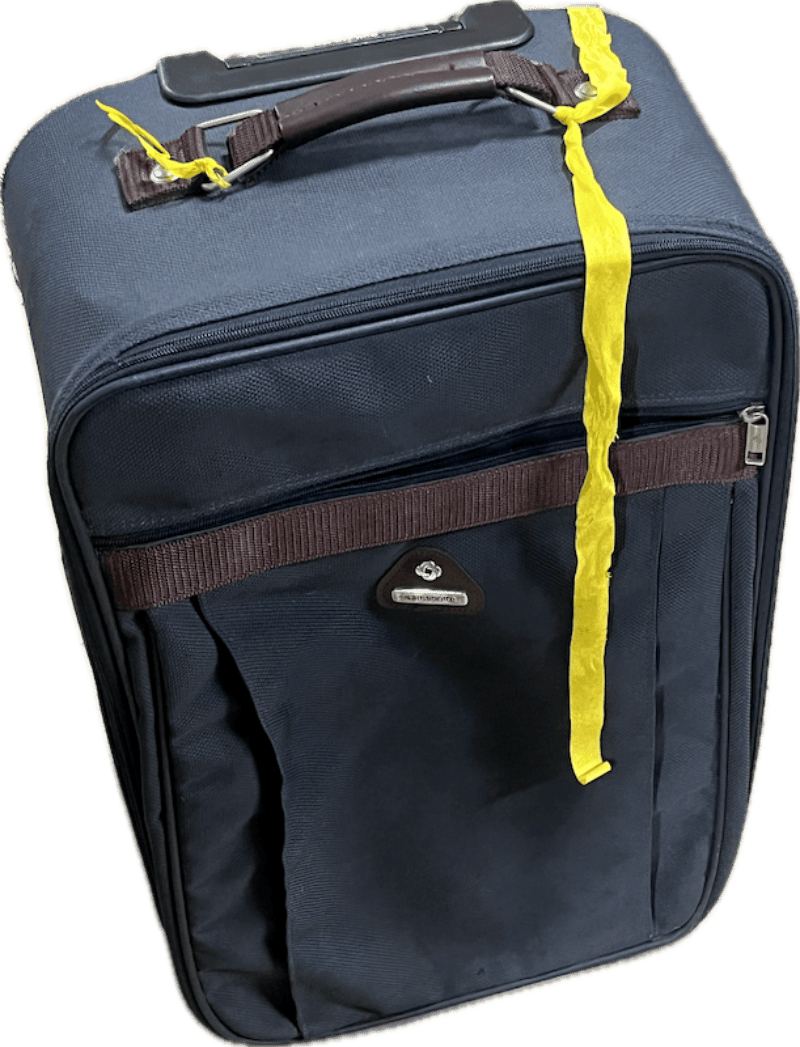 A classic navy soft-sided suitcase featuring a front zip pocket, top carry handle, and a distinctive yellow ribbon tied to the handle.