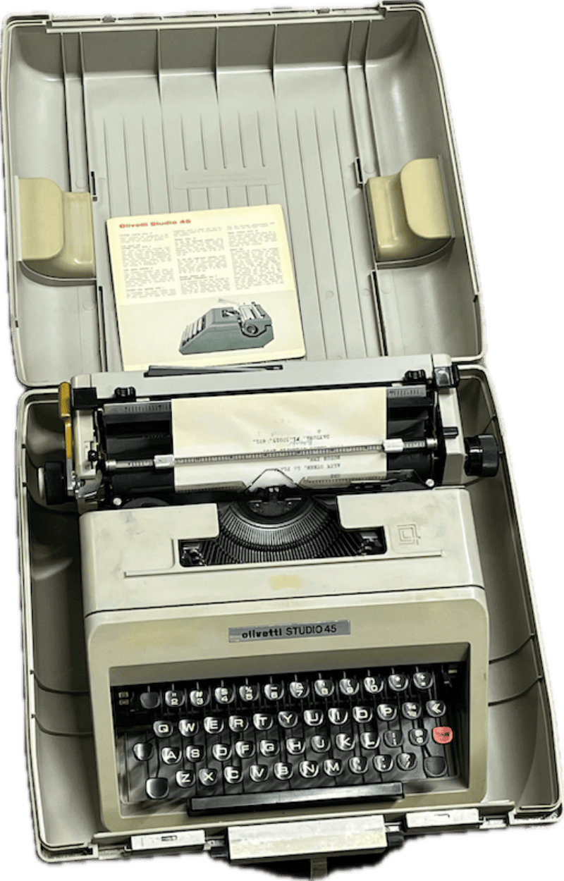 A classic Olivetti Studio 45 portable typewriter in its original hard shell carrying case. This mid-century design features Olivetti’s iconic sleek profile, manual keys, and integrated paper documentation stored inside the lid.