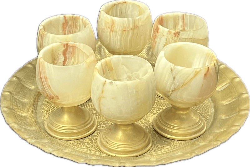 Round brass tray with 6 onyx marble glasses.