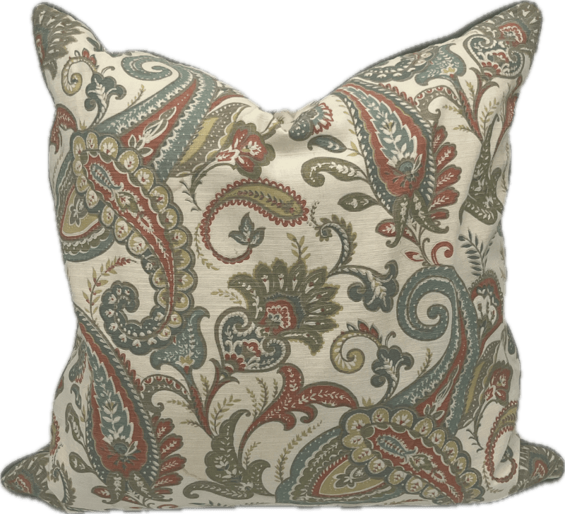 Multicolored paisley print square pillow with blue piping.