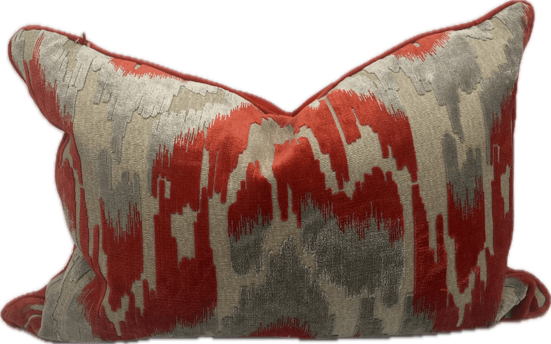 Rectangular orange and grey velvet pillow with abstract ikat design.