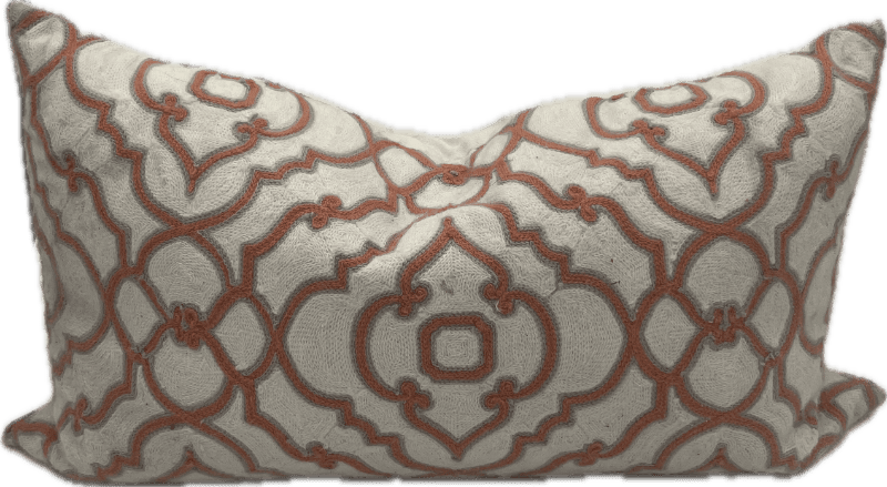 Rectangular pillow with orange trellis embroidered design.